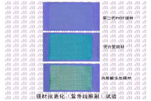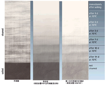 To solve this problem, some film manufacturers "soften" the outermost PVDF coating by mixing a certain proportion of acrylic acid (Acrylic) into the PVDF of the external coating, so as to approach the hardness of the PVC layer, thus making it easier to combine the two. This process, which we call "hybrid PVDF film", has seriously affected the self-cleaning, pollution resistance and durability of PVDF coating due to the addition of a certain proportion of acrylic acid (Acrylic). Therefore, although the anti-peeling performance of "hybrid PVDF membrane" has been greatly improved, the performance of self-cleaning, anti-aging under ultraviolet radiation, anti-fouling and durability has been reduced a lot.