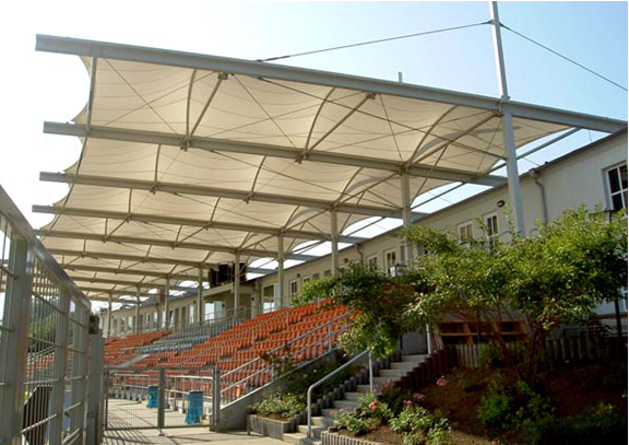 2. Composition of membranes. PVC membranes used in membrane structures are composites formed by coating or laminating PVC (polyvinyl chloride) on polyester fibre fabrics (PES). The material and knitting technology of the base cloth mainly determine the tensile strength and tear strength of the film. At the same time, the surface treatment of the outer coating further provides the physical properties of the film, such as fouling resistance, fire resistance, heat resistance, durability and anti-ultraviolet radiation, as well as increasing the service life of the film.