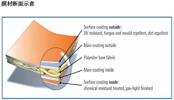 High tension warp and weft polyester filaments provide high strength structural properties for the mechanical part of membrane material structure.