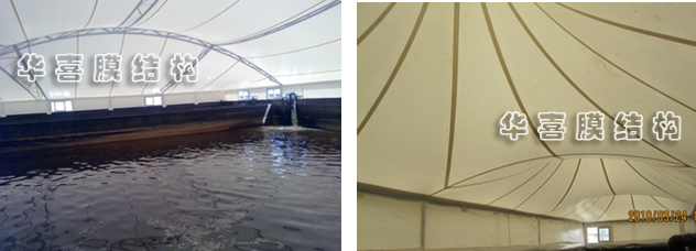 (1) The self-weight of light fluorocarbon fibre membranes is generally only about 1 kg/m2, which belongs to light weight and high strength materials. It is especially suitable for large-span ponds such as sedimentation tanks, which minimizes the influence of the self-weight load of covering materials. In addition, a large number of purlins are needed to support the sunshine plate and FRP, and the membrane is a material reflecting the structural behavior through pre-tension, so it can achieve a large span without any supporting rods in the middle, so the weight of steel members is greatly reduced.
