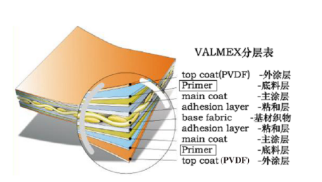 Primer涂层是它介于PVDF涂层和PVC涂层之间,即是在PVC涂层上先涂敷Primer层,然后在Primer层上涂敷100%PVDF。Primer的硬度介于PVDF和PVC之间,这种过渡既能很好的解决剥离的问题,同时并不需要“稀释”PVDF的含量。100%PVDF涂敷的外表层仍然能发挥其应有的作用,保证其各项性能指标不会被降低。