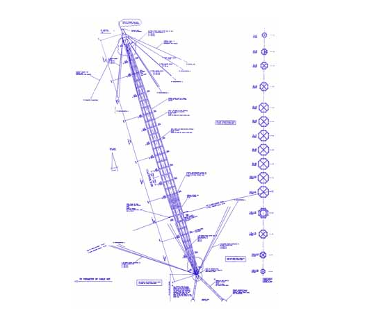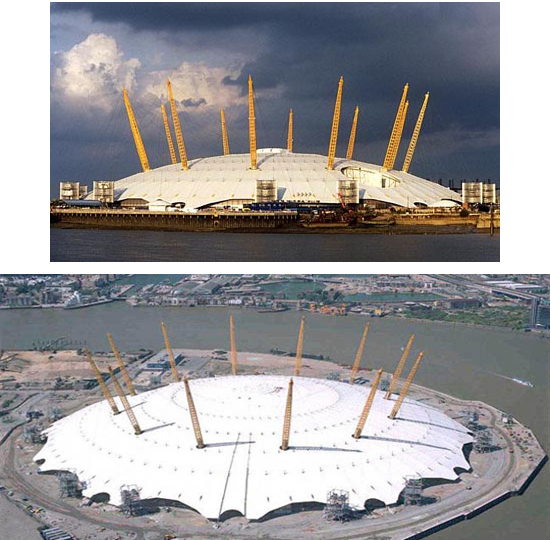 千年穹顶位于伦敦东部泰晤士河畔的格林威治半岛上,是英国政府为迎接21世纪而兴建的标志性建筑。这个工程原先只考虑建成临时性的,后经研究,这项工程不论是从周围市区的复兴,或是建筑交通基础设施的长期投资来说都具有很大价值,1997年英国工党政府上台后,决定建成一个占地73公顷、总造价达12.5亿美元的大型综合性展览建筑。其纵中包括一系列展示与演出的场地,以及购物商场、餐厅、酒吧等,在1999年12月31日揭幕。弯项直径320m,周圈大于1000m,有12根穿出屋面高达100m的桅杆,屋盖采用圆球形的张力膜结构。膜面支承在72根辐射状的钢索上,其截面为2×φ32,这些钢索则通过间距25m的斜拉吊索与系索为桅杆所支撑,吊索与系索同时对桅杆起稳定作用。另外还设有四圈索行架将钢索联成网状。桅杆为梭形,由纵向的圆钢管与横向的方钢相贯焊接成格构状,桅杆沿直径200m的圆周设置,支承在由四根杆组成的四角锥形底座上。一些细钢索从高10m的底座引出,因而不妨碍展出。